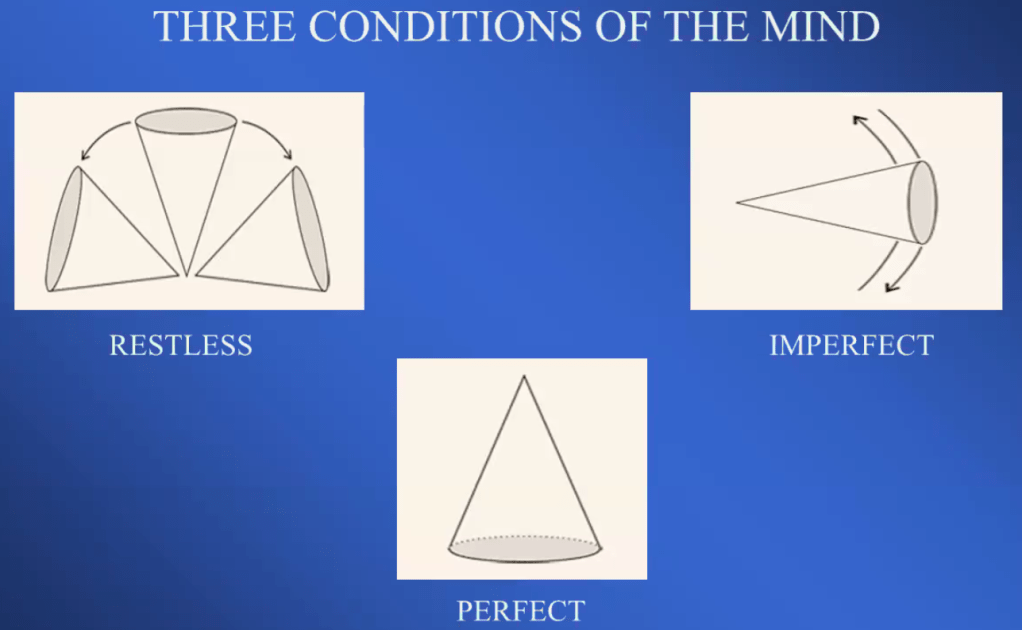 Self-centered one will have the restless mind. The cone standing upside down will never stand steady and it will fall down. He or she is continuously agitated. An imperfect mind is there but with little blow of air it keeps oscillating. One negative incident will alter his or her peace. Depending on this incident, the imperfect mind oscillates. A lady took her husband for the charity event and at the time of event a distant friend passes a comment on her saying “what happened you seem to have aged”. The lady gets upset and reduces the amount of her pledge form $25K to $10K. One incident can later you, agitate you for a minute, 30 days or 30 years. Just one incident could make the folks enemies. One negative experience is all it takes to get one’s ego involved. Both restless mind and imperfect minded people needed diet plan. Perfect mind goes through the life experiences and tranquility.