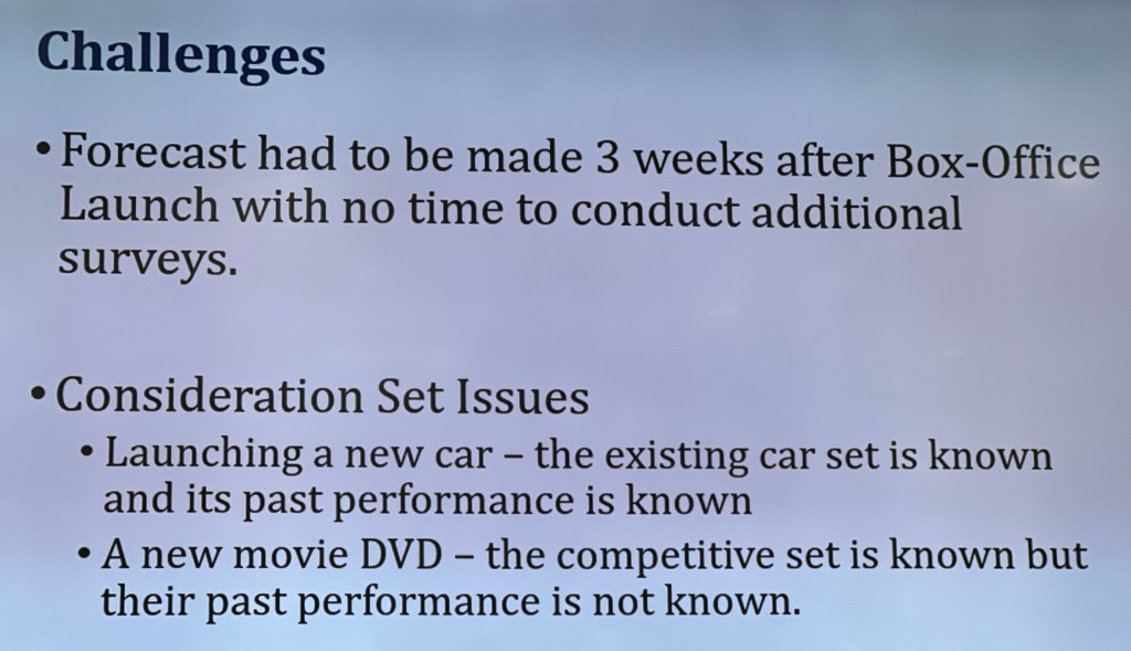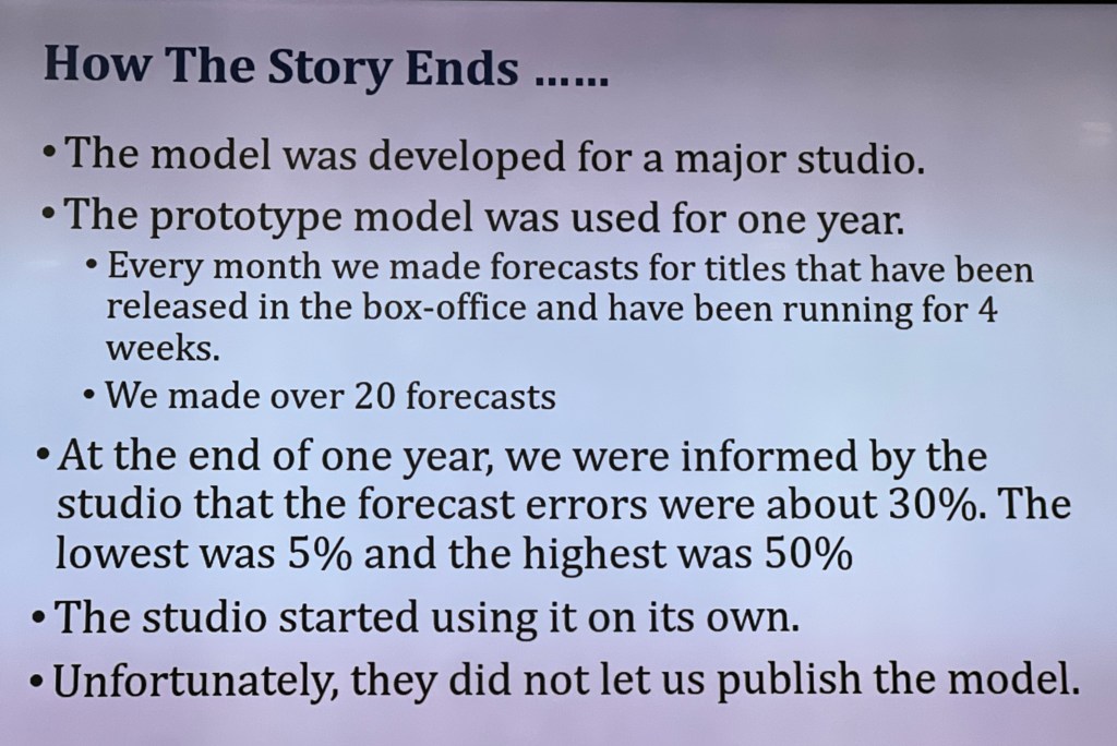 Second challenge: This professor from Israel told me “even though I made good predictions, studios don’t listen to my models and they still go ahead and do what they want to do despite the past where my predictions worked”.
