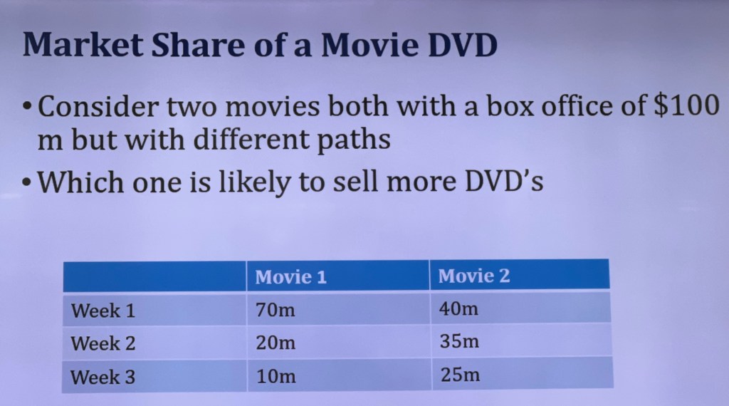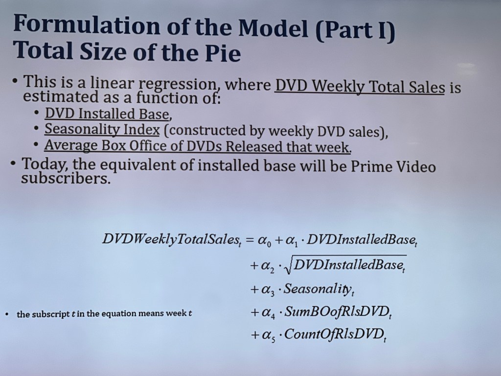 Predict the sales in week t, t+1 and t+2. What is the install base of people who can buy. Say existing DVD buyers or Netflix as the platform installed base. I know which titles are coming and the calendar is announced. Industry knows it. Box office and rental calendars are known. These are known variables. We can use them to predict what will be total sales for the week.