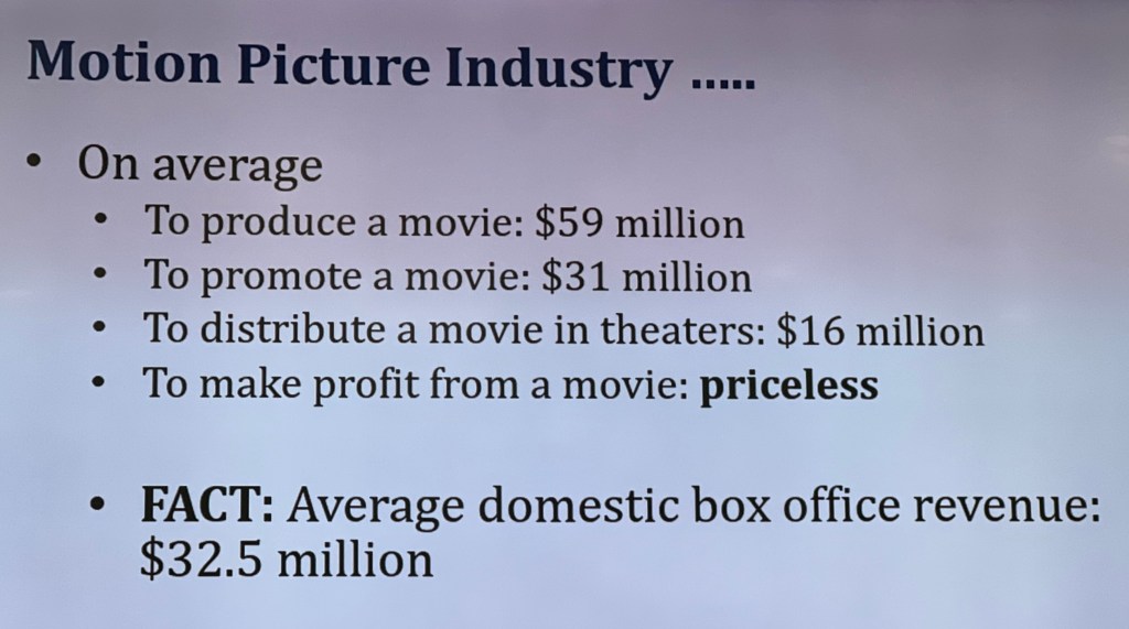 This work is about 10 years old but can be easily related. On an average it costs $59 million to produce a movie in Hollywood. Then $31 million for marketing. Then $16 million for distribution.